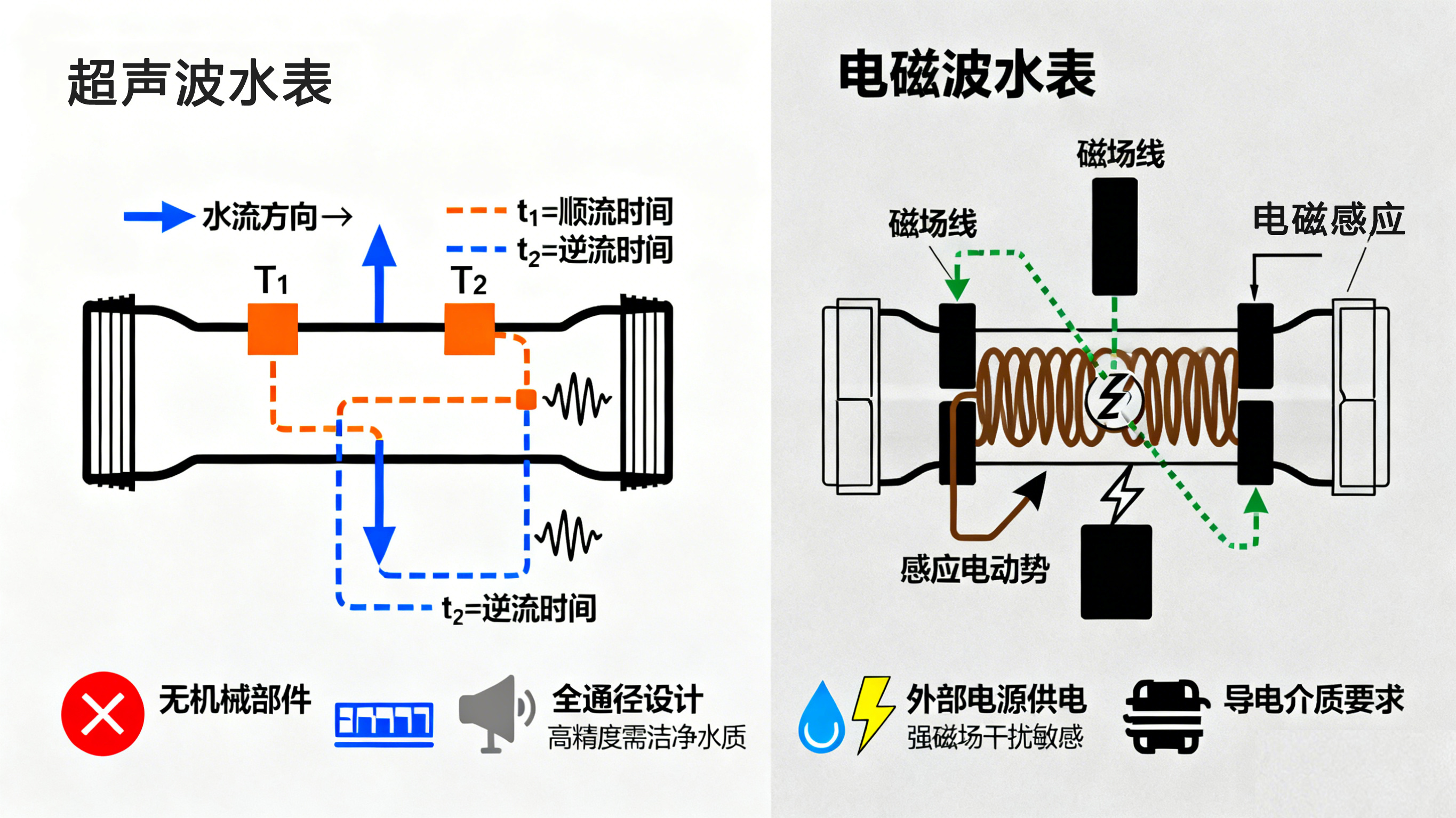 | 特性 | 電磁水表 | 超聲波水表 |