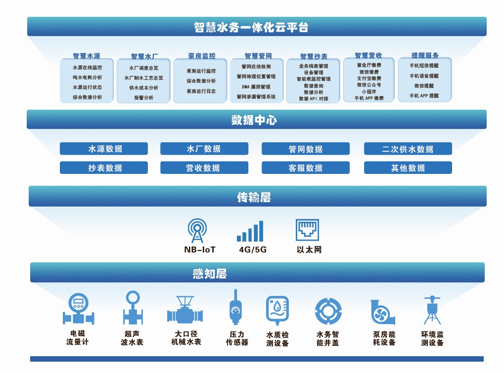面對城鄉(xiāng)供水一體化的多重挑戰(zhàn),智慧水務(wù)系統(tǒng)提供了一種系統(tǒng)性解決方案。這種以物聯(lián)網(wǎng)技術(shù)為核心的管理體系,通過分層架構(gòu)設(shè)計(jì),實(shí)現(xiàn)從水源到用戶的全流程智能化管控。智慧水務(wù)系統(tǒng)的架構(gòu)可分為四個(gè)關(guān)鍵層次:感知層、通信層、數(shù)據(jù)層和應(yīng)用層。感知層部署在水務(wù)系統(tǒng)的關(guān)鍵節(jié)點(diǎn),包括電磁流量計(jì)、壓力傳感器等設(shè)備,負(fù)責(zé)實(shí)時(shí)采集供水系統(tǒng)的運(yùn)行數(shù)據(jù)。這些設(shè)備如同水務(wù)系統(tǒng)的“神經(jīng)末梢”,時(shí)刻監(jiān)測管網(wǎng)壓力、流量和水質(zhì)參數(shù)。通信層則構(gòu)建了數(shù)據(jù)傳輸?shù)?ldquo;高速公路”,采用以光纖為主、4G/Wi-Fi/專網(wǎng)為輔的混合通信網(wǎng)絡(luò)。這種設(shè)計(jì)既保障了核心區(qū)域的高速穩(wěn)定傳輸,又兼顧了邊遠(yuǎn)地區(qū)的覆蓋需求,實(shí)現(xiàn)了城鄉(xiāng)全域的數(shù)據(jù)聯(lián)通。數(shù)據(jù)層是智慧水務(wù)的“大腦中樞”,構(gòu)建了多源數(shù)據(jù)融合中心,包含空間數(shù)據(jù)庫、實(shí)時(shí)數(shù)據(jù)庫和業(yè)務(wù)數(shù)據(jù)庫。通過ETL工具對數(shù)據(jù)進(jìn)行清洗轉(zhuǎn)換,消除“數(shù)據(jù)孤島”,生成統(tǒng)一的數(shù)據(jù)模型,為上層應(yīng)用提供標(biāo)準(zhǔn)化數(shù)據(jù)支持。應(yīng)用層直接面向水務(wù)管理者和用戶,設(shè)立綜合智慧調(diào)度、設(shè)施全周期管理和公共服務(wù)平臺。這些平臺涵蓋管網(wǎng)監(jiān)測、水質(zhì)監(jiān)控等核心模塊,通過調(diào)度大屏、運(yùn)維APP和小程序等多終端,為不同角色提供定制化服務(wù)。